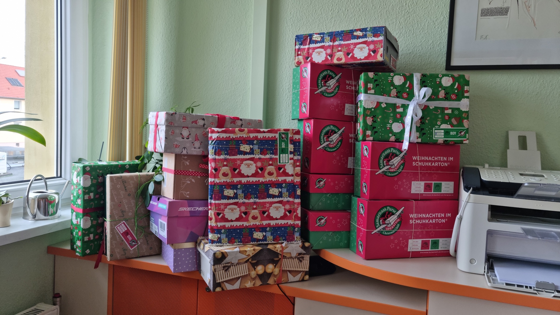 Vielen Dank an die fleißigen Weihnachtsmänner in diesem Jahr. Es sind tatsächlich 16 Kartons zusammengekommen, die jetzt auf die Reise gehen können.